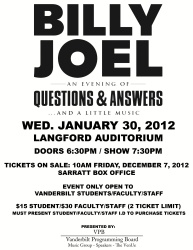 Before winter break, it was announced that Billy Joel was coming to Vanderbilt! While I am not necessarily the biggest fan that you will ever meet, I knew what a rare opportunity it would be for me to hear him speak at Vanderbilt, so I trekked to Sarratt Box Office one morning with my friends, and we stood in a ridiculously long line to secure tickets for only 15 dollars! (Seriously, what a deal.)
